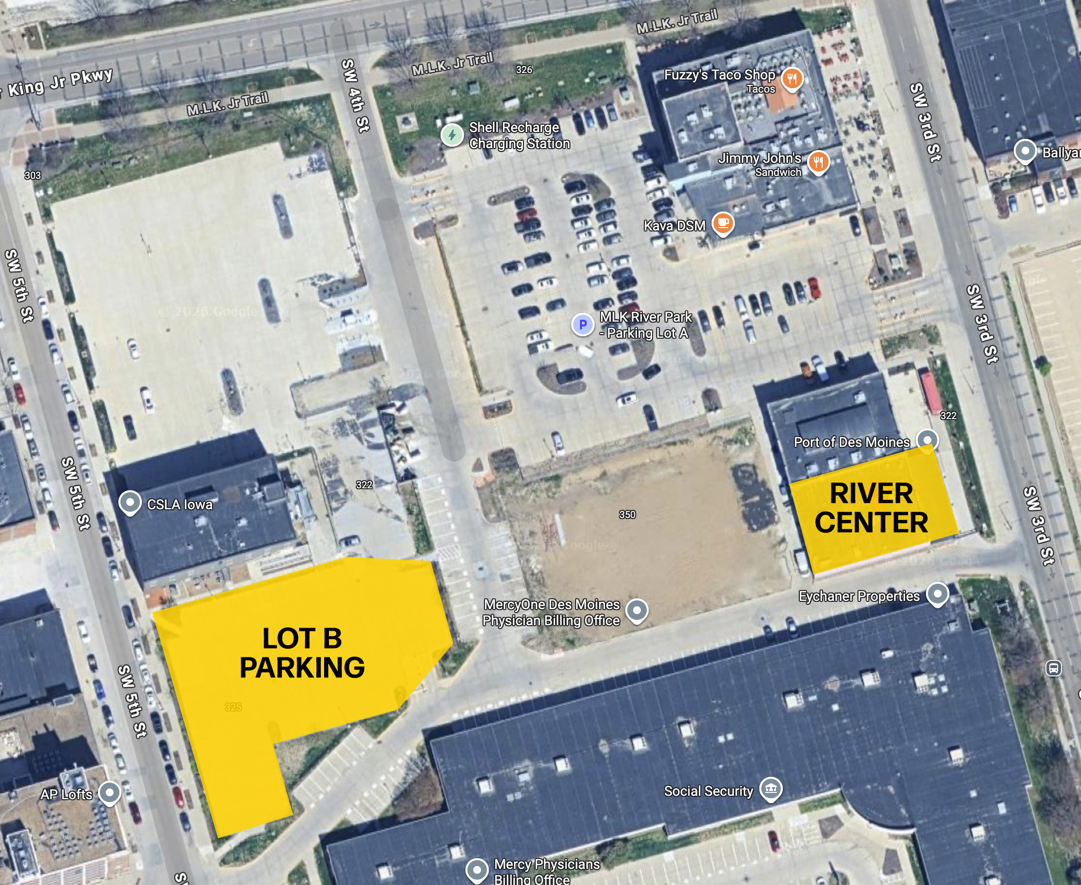 Please enter at the driveway immediately south of 340 SW 3rd Street, then continue west for approximately 400 feet to reach Parking Lot B. Signs will be posted to help guide you.